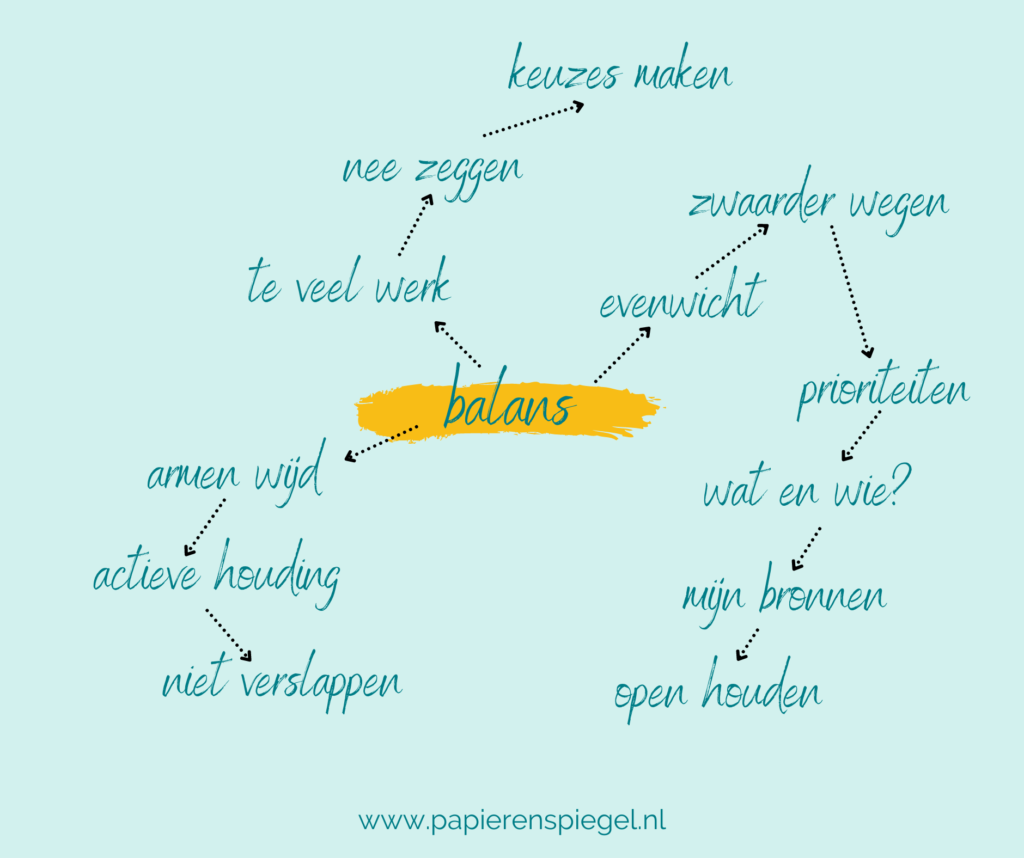In het voorbeeld hieronder: balans. - Welk volgend woord komt er in je op als je aan het beginwoord denkt? Schrijf dat in de buurt van het beginwoord en verbind deze woorden met een lijn.